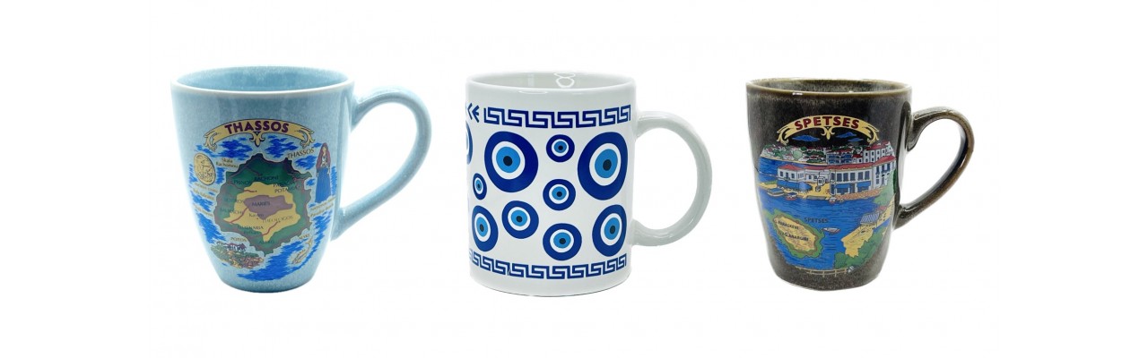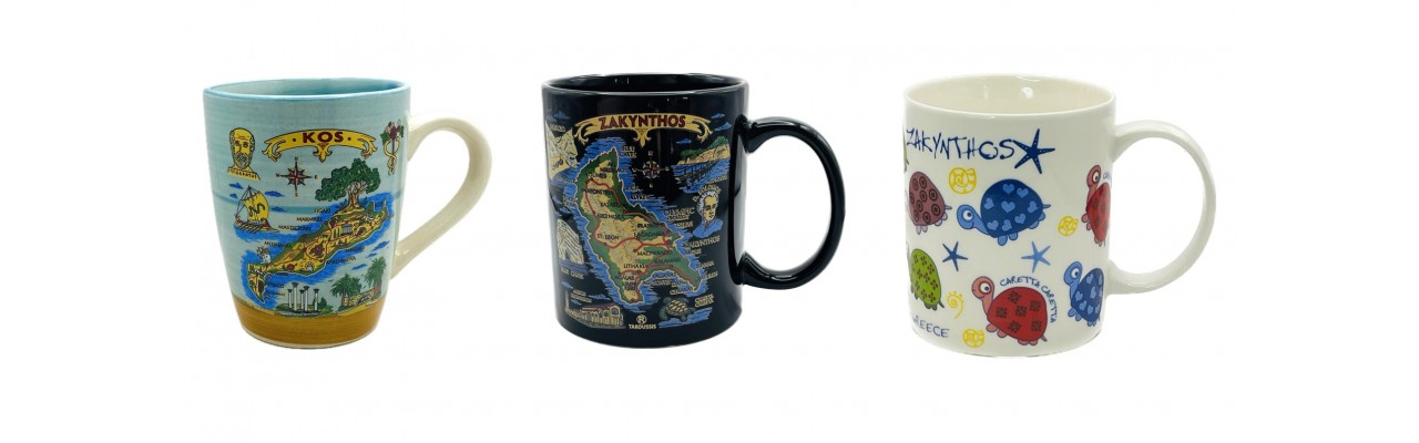 δαχτυλήθρες, σφηνάκια, ποτήρια, τασάκια κτλ διακοσμημένα με μεταξοτυπίες με θέματα από διάφορα κυρίως τουριστικά μέρη της Ελλάδας ή αξιοθέατα.